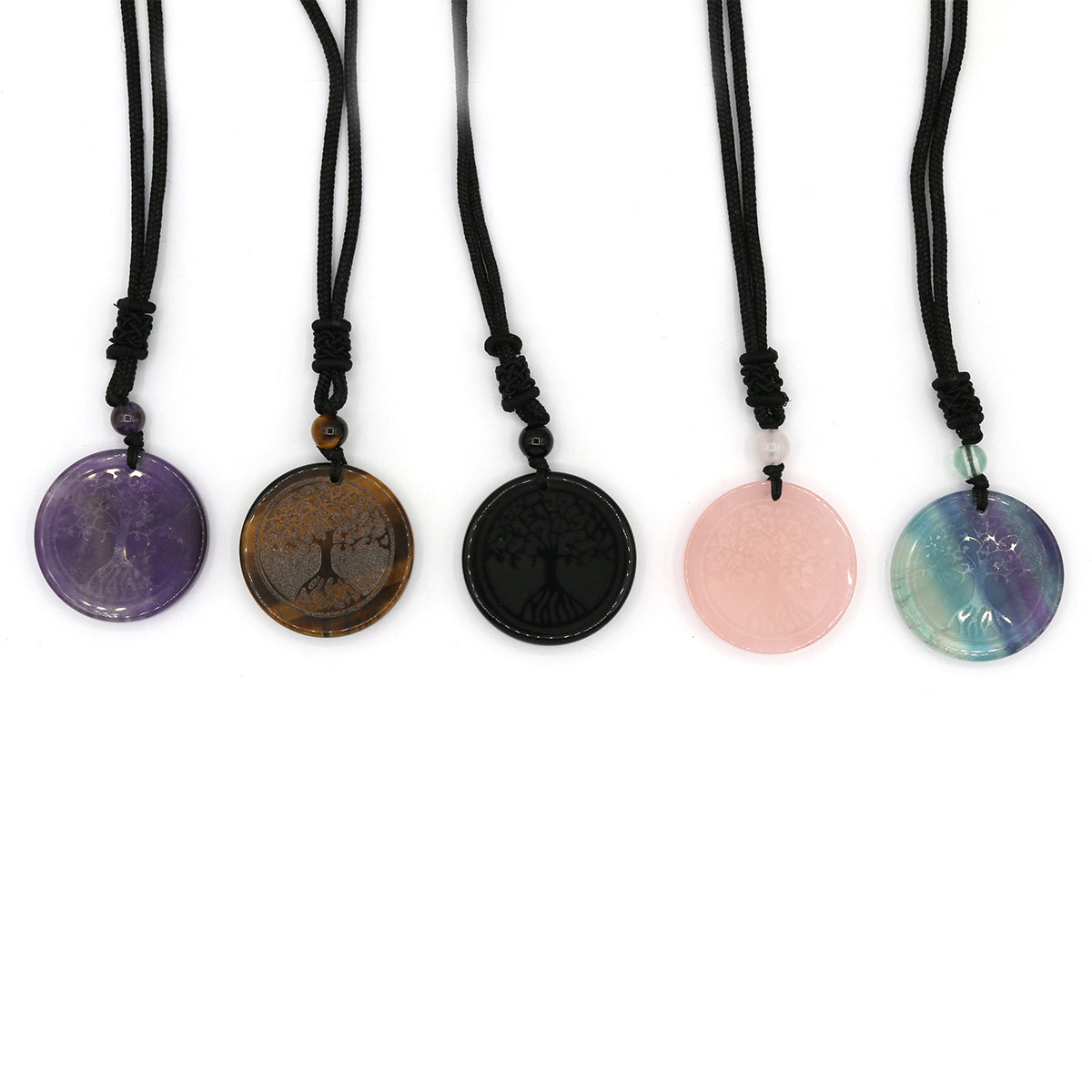 Rose quartz/tiger eye/black agate /amethyst/fluorite gemstone round flat tree texture pendant