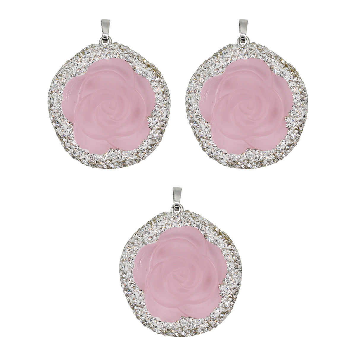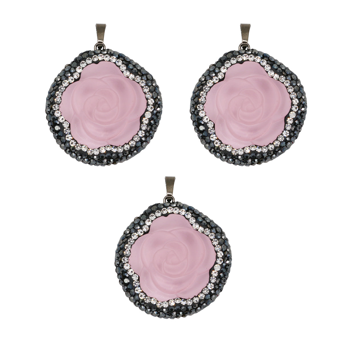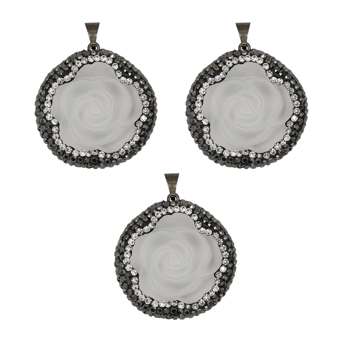 White/ pink glass flower crystal pendant with black and silver color metal, 1.4inch wide, 1.77inch tall . around 0.03lb/pc. Sale by piece. Silver color crystal with white glass pendant is out of stock, fell free to contact us if you needed.